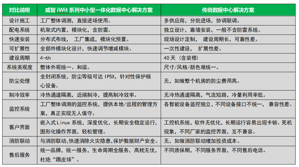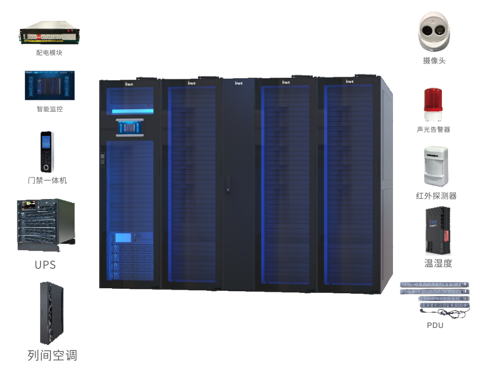 威智iWit中小型-体化数据中心将小型或中型数据中心所需的所有设备全部集成于冷热通道全封闭的柜体内,并配置各种环境数据采样传感器,由eSite云图监控系统进行统一的监控及管理,将整个数据中心标准化于更小的空间内,为客户设备提供安全可靠的运行环境,且大大提升远程智能管理能力,无需专业的工程师进行维护,使建设、运维等都大大简化。