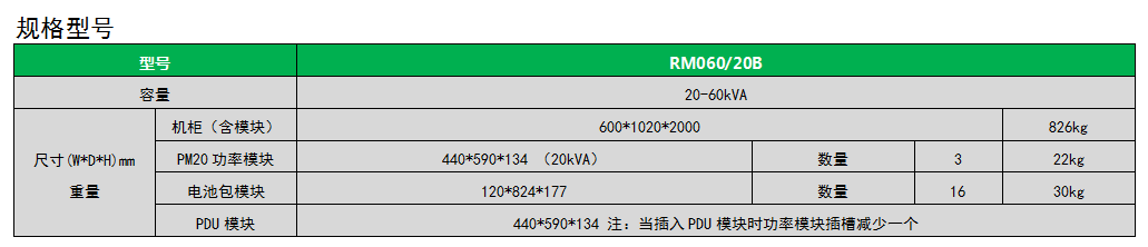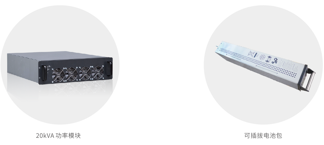 支持20kVA功率模块。可选配3个功率模块、16个可插拔电池包模块,单机柜实现高可用性,高可靠性,灵活性,低成本,节省占地面积于一体的模块化UPS供电系统。满载情况下可提供约10分钟的续航能力。