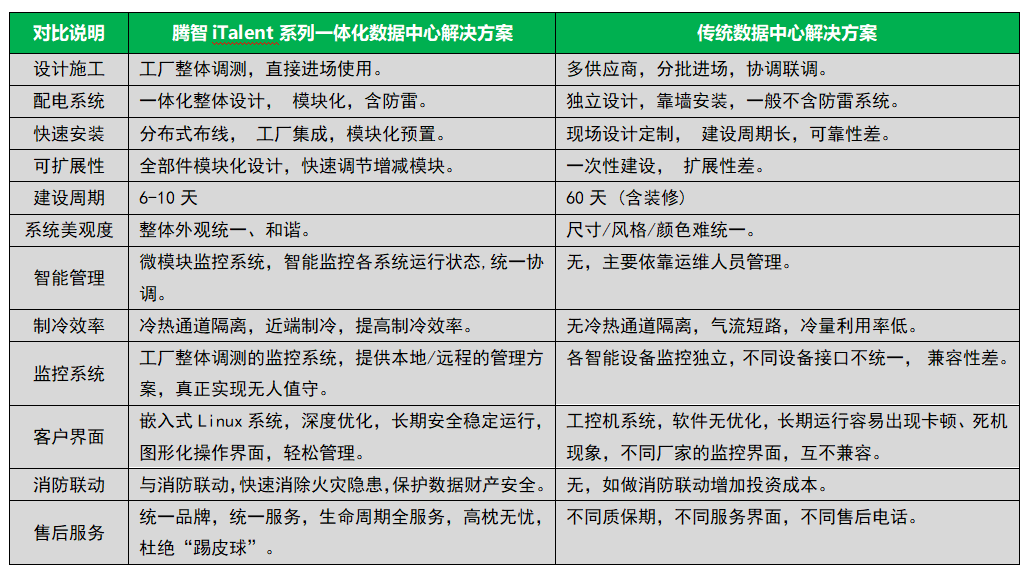 腾智iTalent系列一体化数据中心采用模块化设计,将供配电系统、空调系统、机柜系统、封闭通道系统、监控系统及布线系统集成于一体,并配置各种环境数据采样传感器,由eSite云图监控系统进行统一的监控及管理,实现自动控制、智能运维,提升数据中心的可靠性、可用性及可维护性。