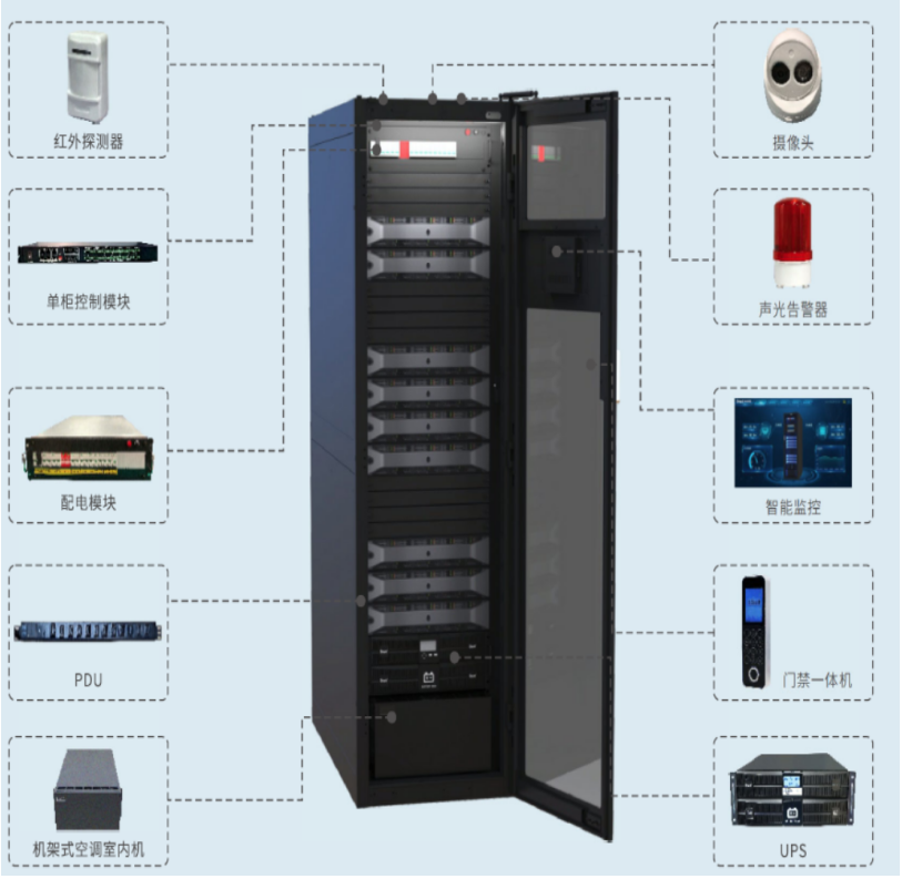 单机柜整体占地面积为0.72平方米,适合于10-20平方米以内的机房。